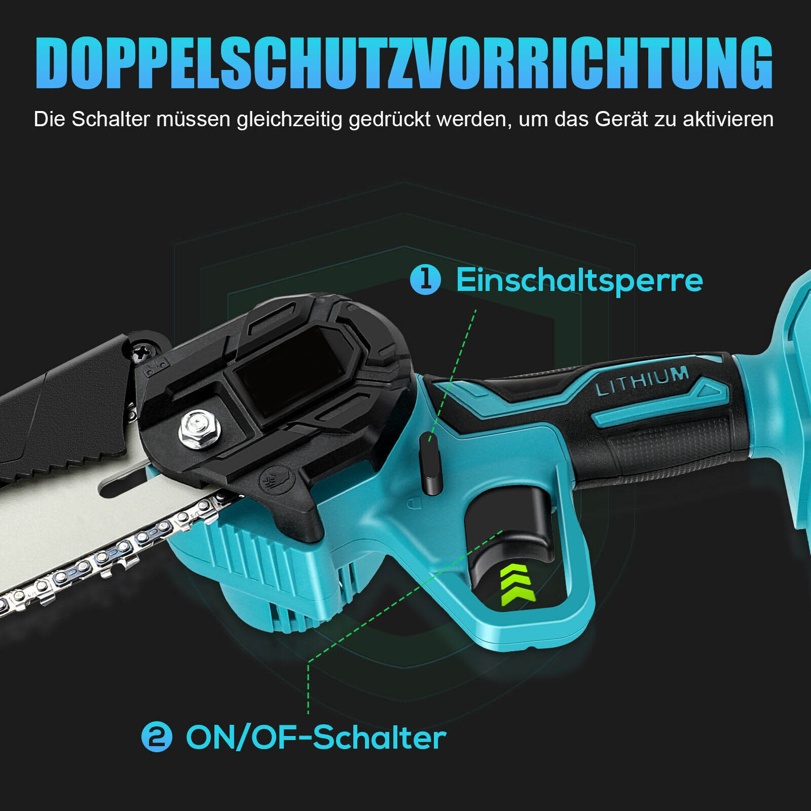 Um die Säge zu starten, müssen die Sicherheitsverriegelung und der Auslöser gleichzeitig gedrückt werden, so dass Sie keine Angst haben müssen, versehentlich Personen zu verletzen