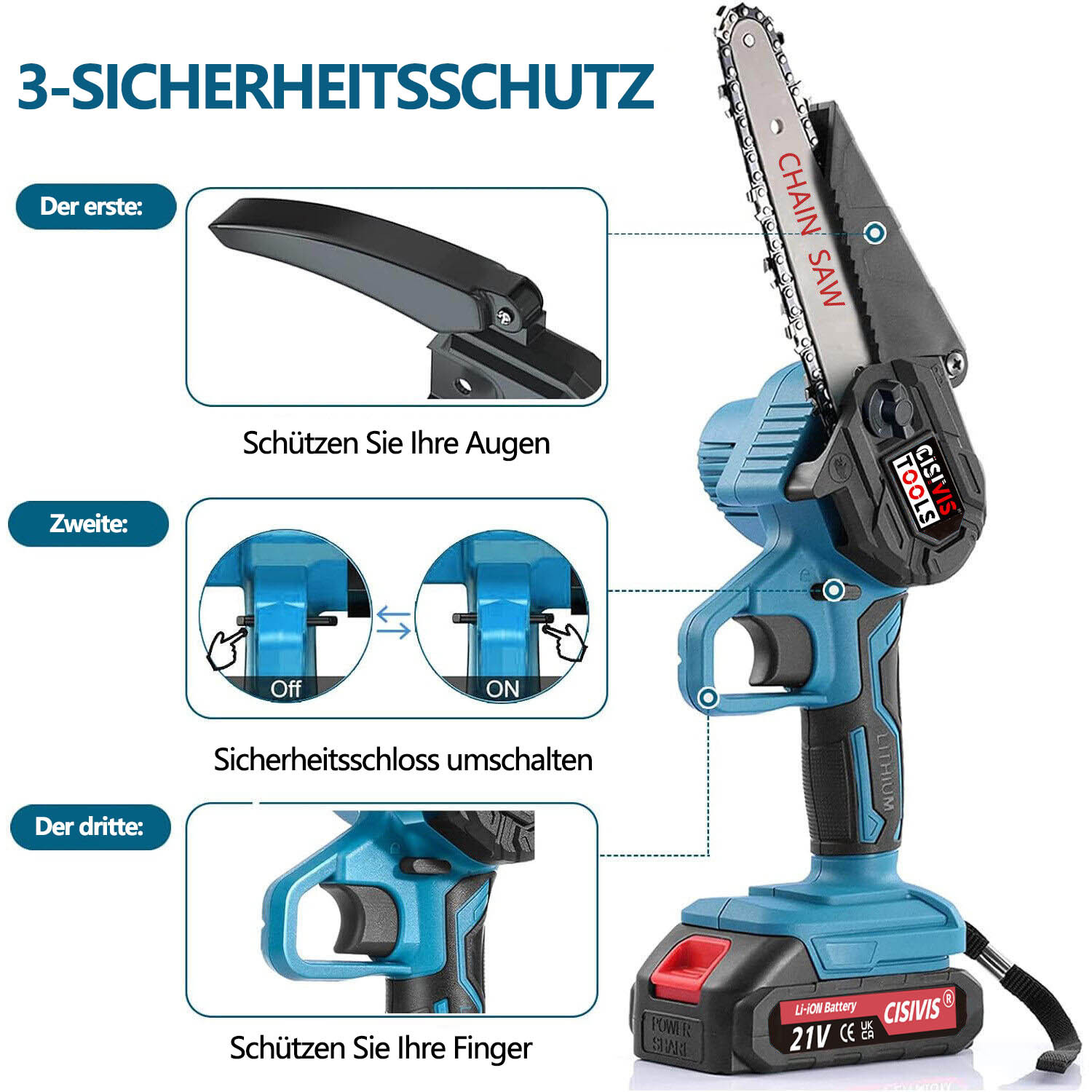 SICHER UND ZUVERLÄSSIG – 2 Sicherheitsmaßnahmen sorgen dafür, dass die Mini-Kettensäge über zuverlässige Sicherheit verfügt: