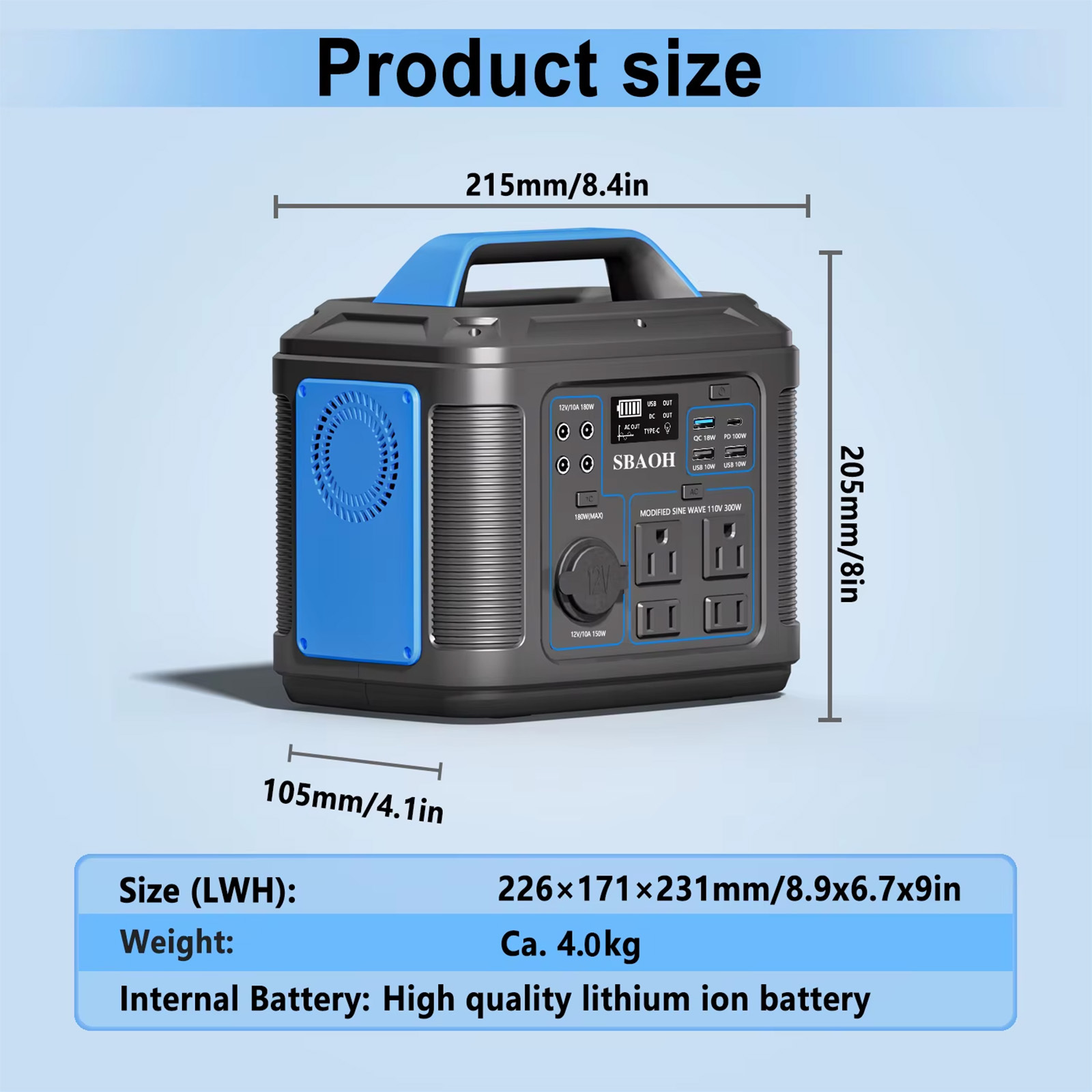 -Capacity: 296Wh -Weight: 6.6 lbs -Size: 8.1 * 8.5 * 5.9 in