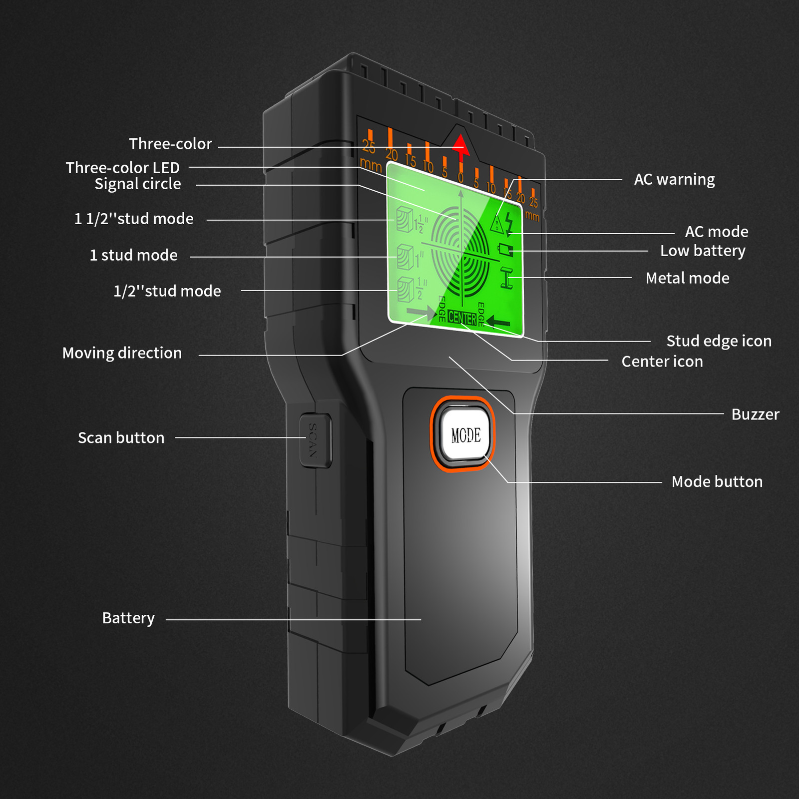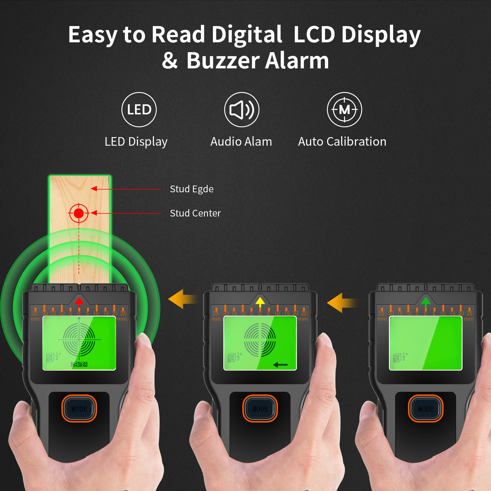 ������.Accurate and Fast: The stud detector uses a smart micro-sensor chip with the highest sensitivity to accurately and quickly find the edges and centers of metal, studs, joists, pipes and live AC wires behind walls, floors and ceilings. Rapid detection saves users time and effort, making task completion easier. Whether you are a professional, a homebody, or a DIY enthusiast, it is definitely the best choice.