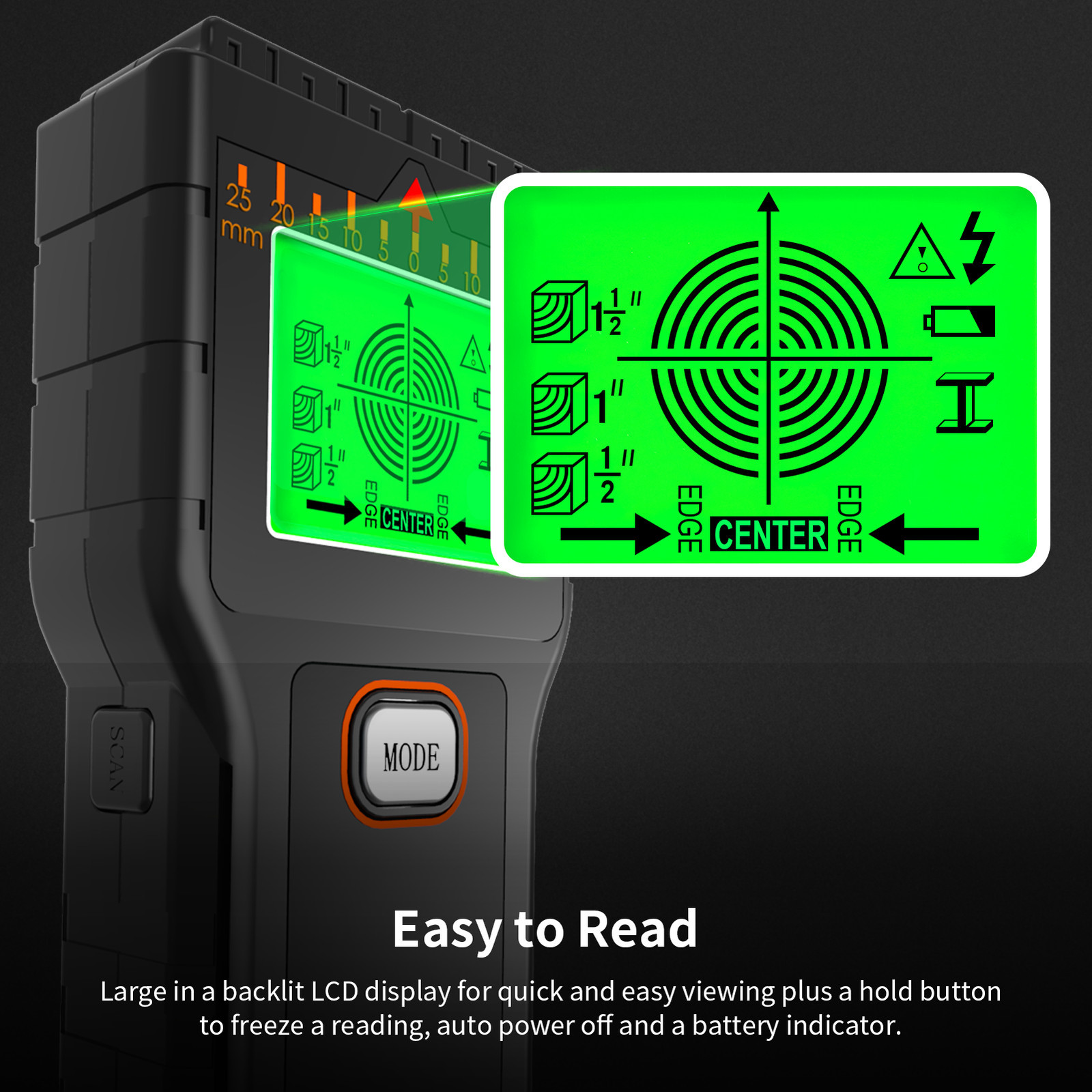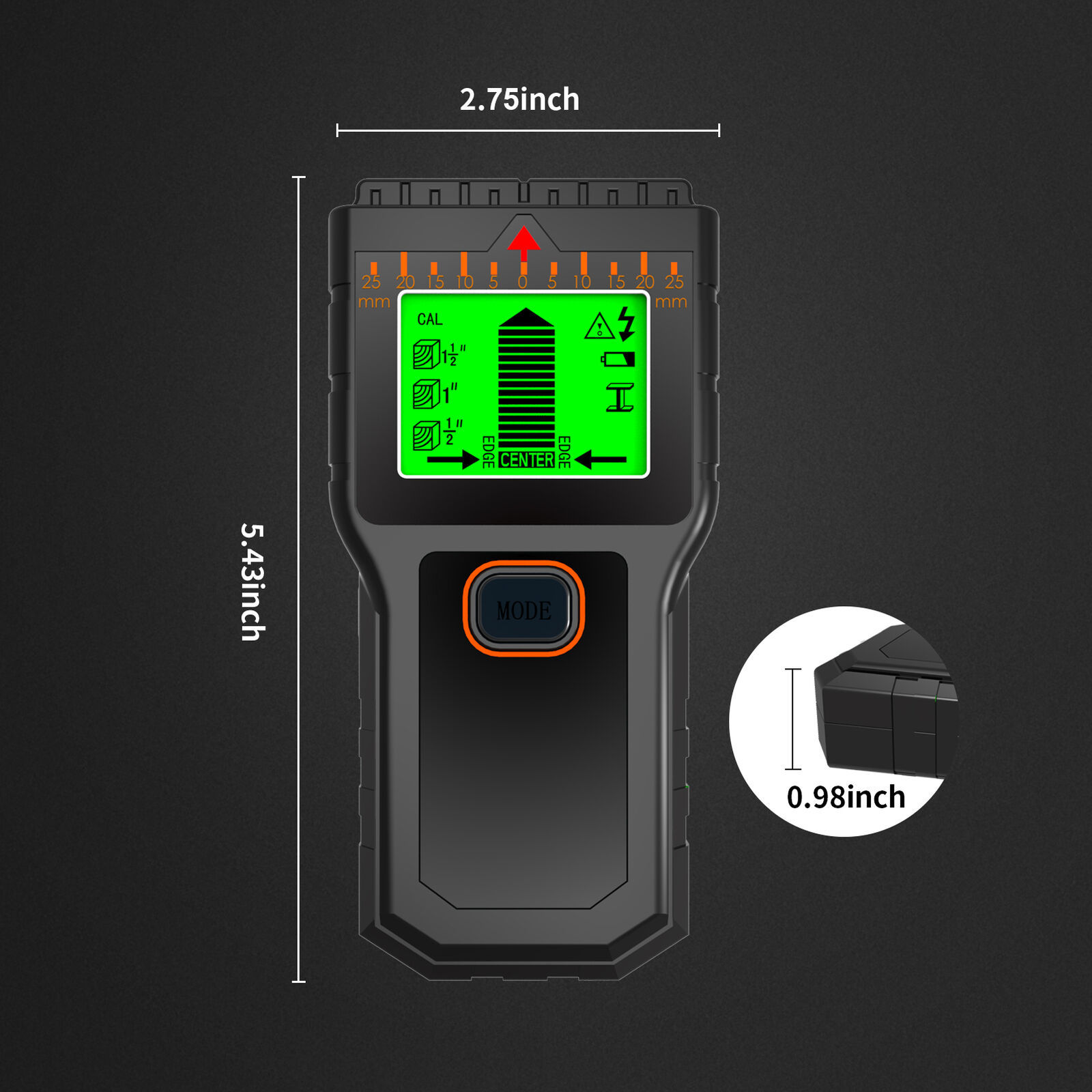 ������.Easy to use and auto-calibration: The easy-to-read LCD display and ergonomic anti-slip handle allow users to feel comfortable and convenient while scanning. The wall detector can be automatically calibrated at any position on the wall to successfully find the center of the joist in one ste p. This feature provides users with maximum reliability, significantly reduces errors in applications and ensures that most objects behind walls can be detected.