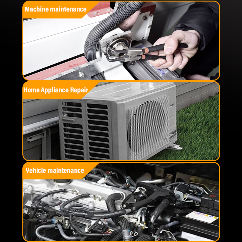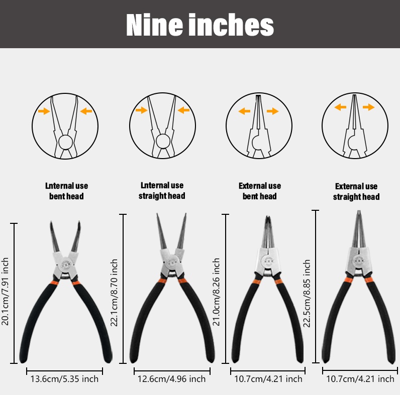 Purpose: Suitable for disassembling and installing snap springs in internal spaces. The design of the curved mouth facilitates flexible operation in narrow and angled spaces, and can accurately clamp the internal snap spring.