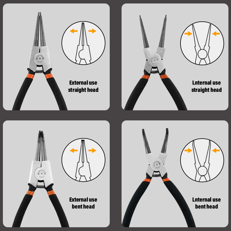 Purpose: Used for handling external snap springs, the straight mouth can directly and quickly clamp the external snap spring. In relatively open external spaces, it is efficient and convenient to use, and can be used for snap spring installation and removal operations.