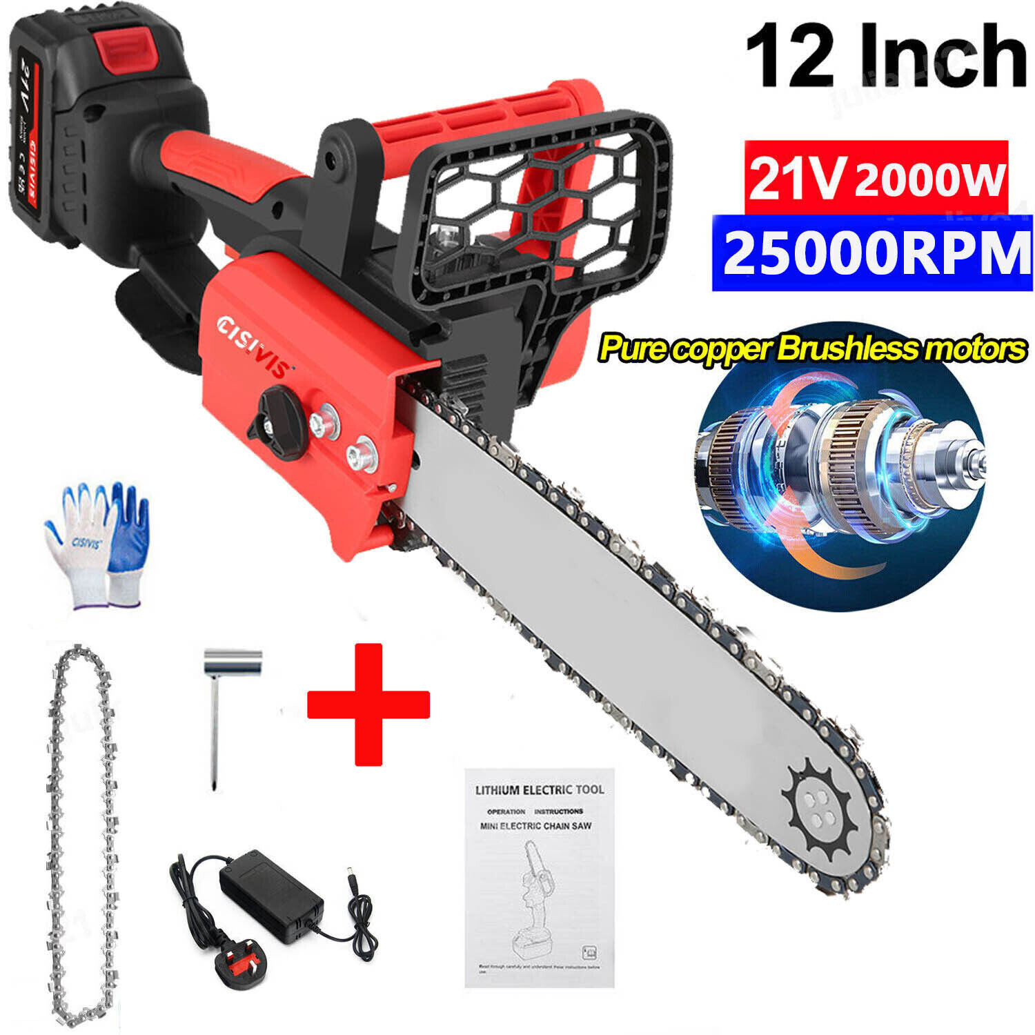 Spezifikationen Farbe Rot Produktname: 12-Zoll-Elektrokettens����ge Spannung: 21V Batteriekapazit����t: 3000 mAh Ausgchwindigkeit: 19,69 Fu����/s (6 m/s) Gewicht: 3 kg (6,6 lbs) Motorbetrieben: B����rstenloser Motor aus reinem Kupfer Material: ABS + Weichgummi + Metall