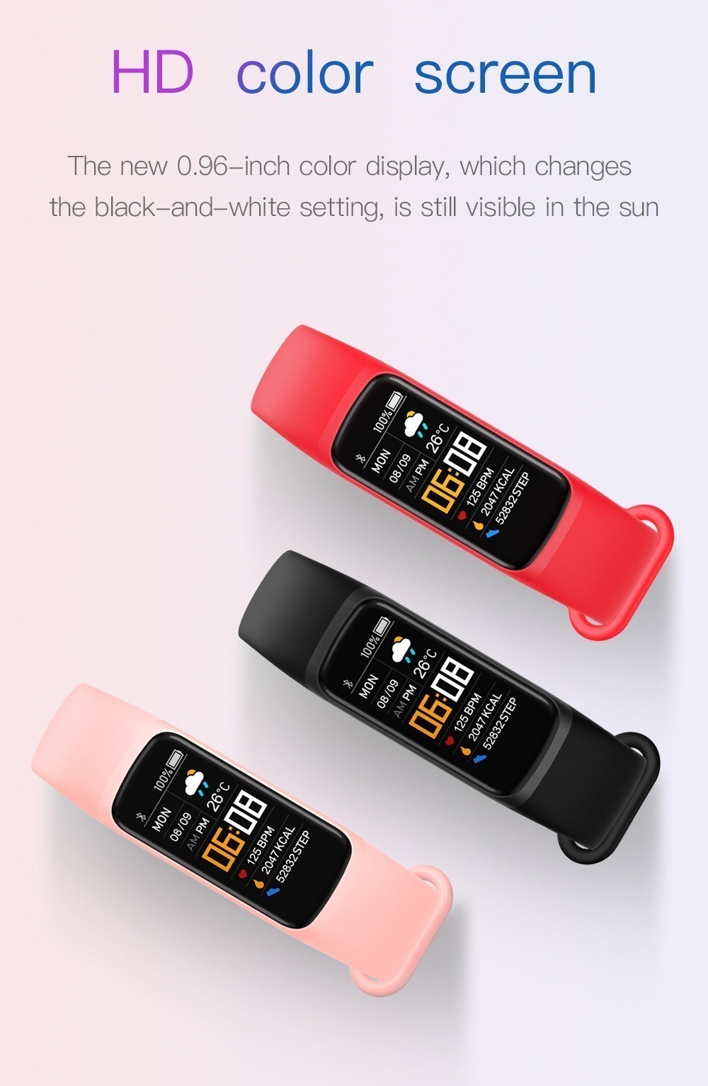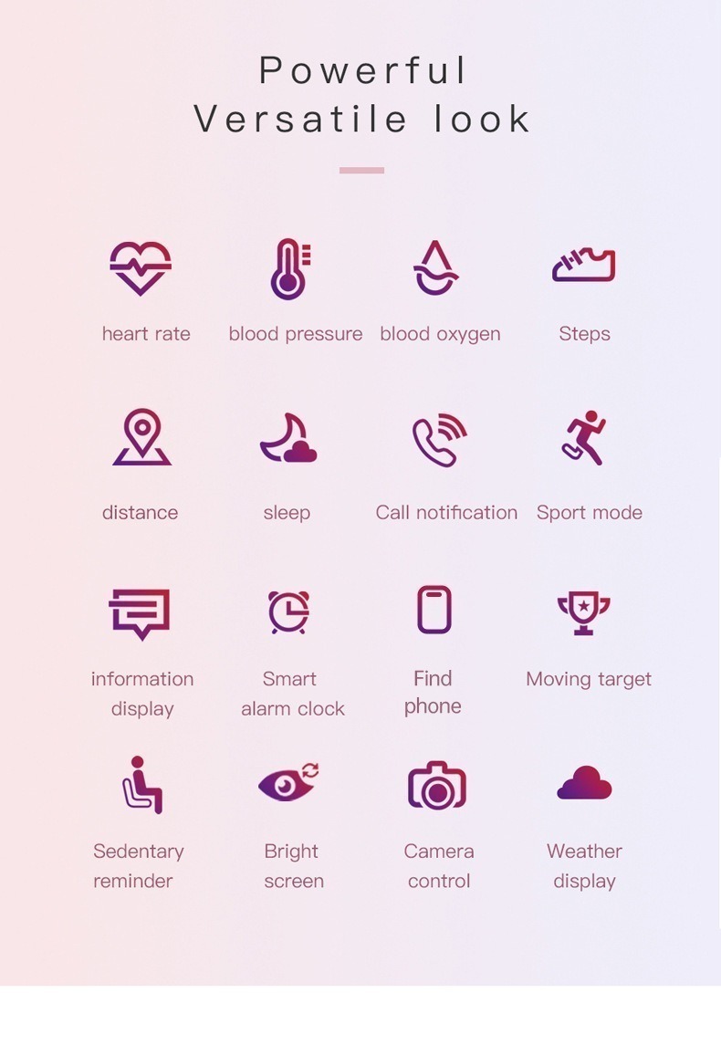 Functions: Waterproof, photo taking, step counting, heart rate monitoring, blood pressure measurement, social entertainment, Bluetooth call, smart reminder, remote control selfie, sleep monitoring, blood oxygen detection