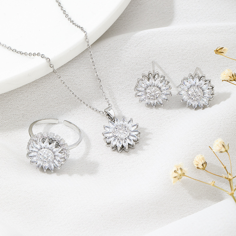 Color: M-121 sunflower necklace, J-26 sunflower ring, E-20 sunflower stud earrings (925 silver needle),T-22 sunflower (set of 3),T-10 (silver) sunflower set