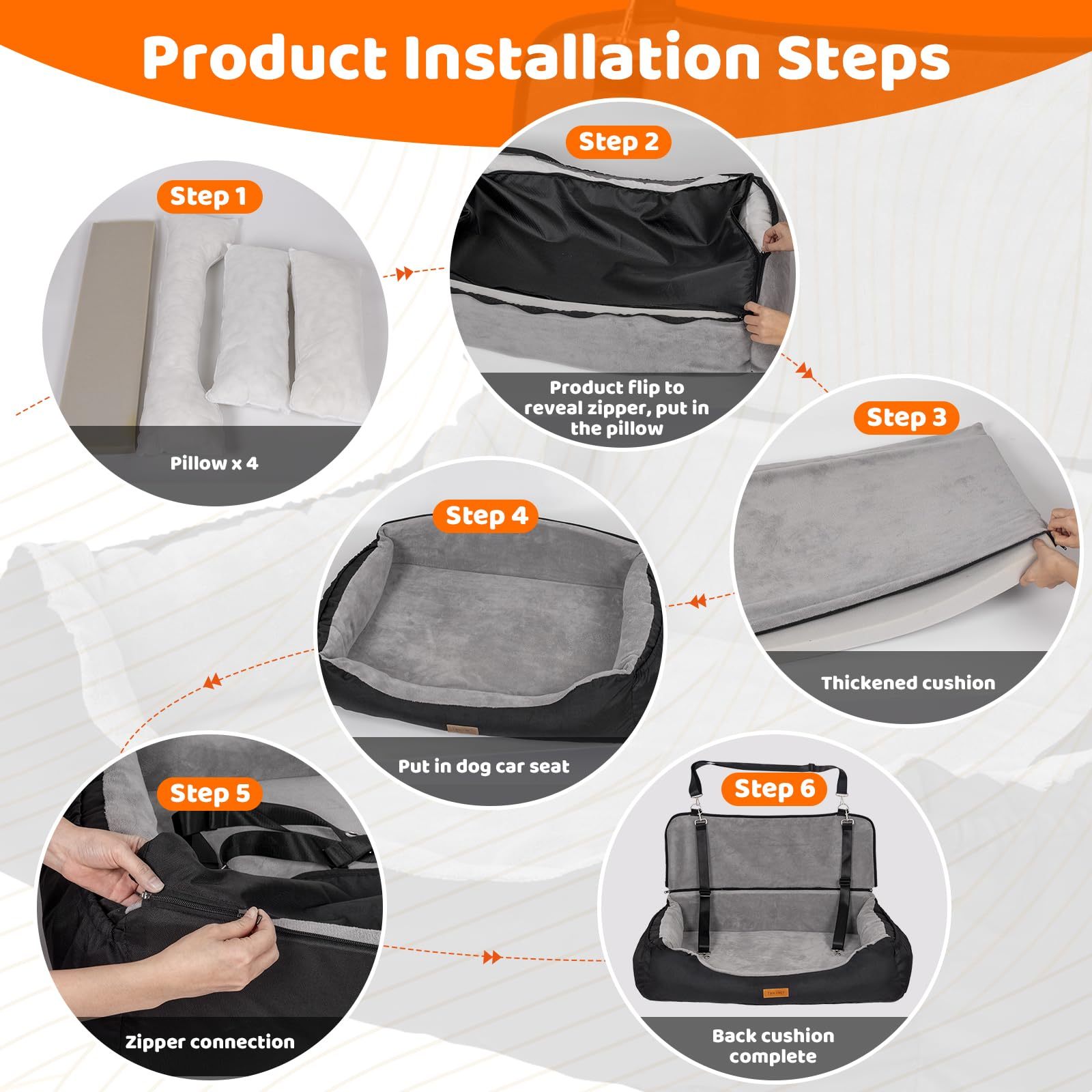 - EASY INSTALLATION – TWICEMET Dog Car Seat To minimize damage during shipping, we pack the insert and cover separately. The installation process is very simple, refer to the instructions and videos we provide. Flip the cover over to find the zipper, pull it open and put in 3 pillows and put 1 back cushion on the side near the back; then put the padded cushion into the cushion cover and the installation is complete.