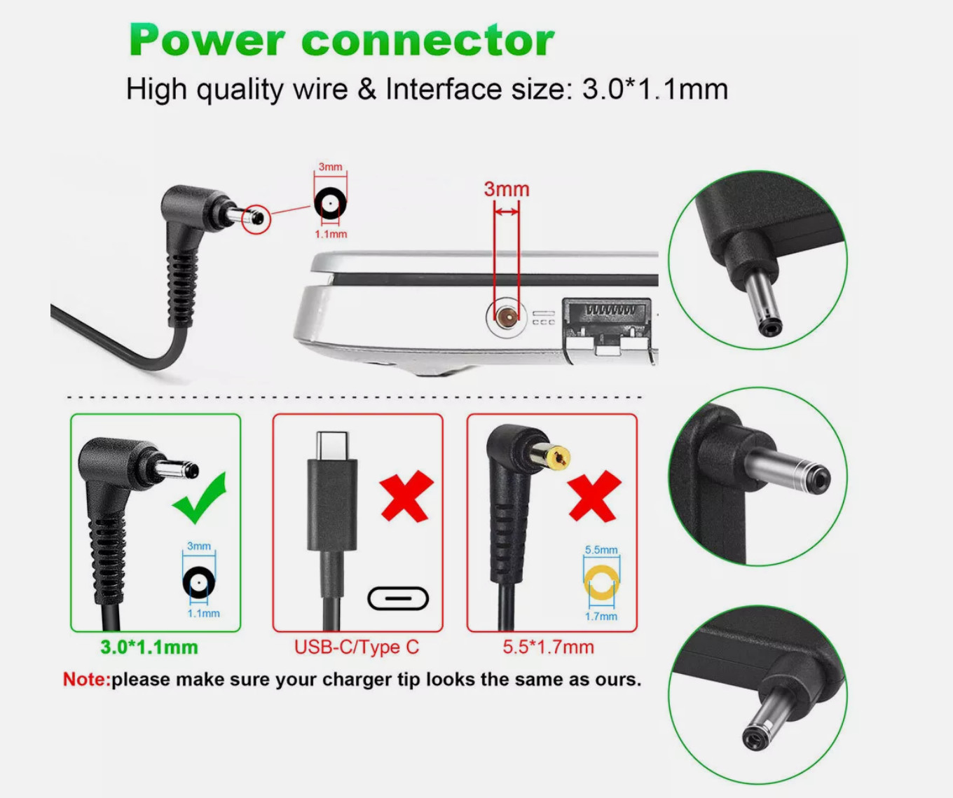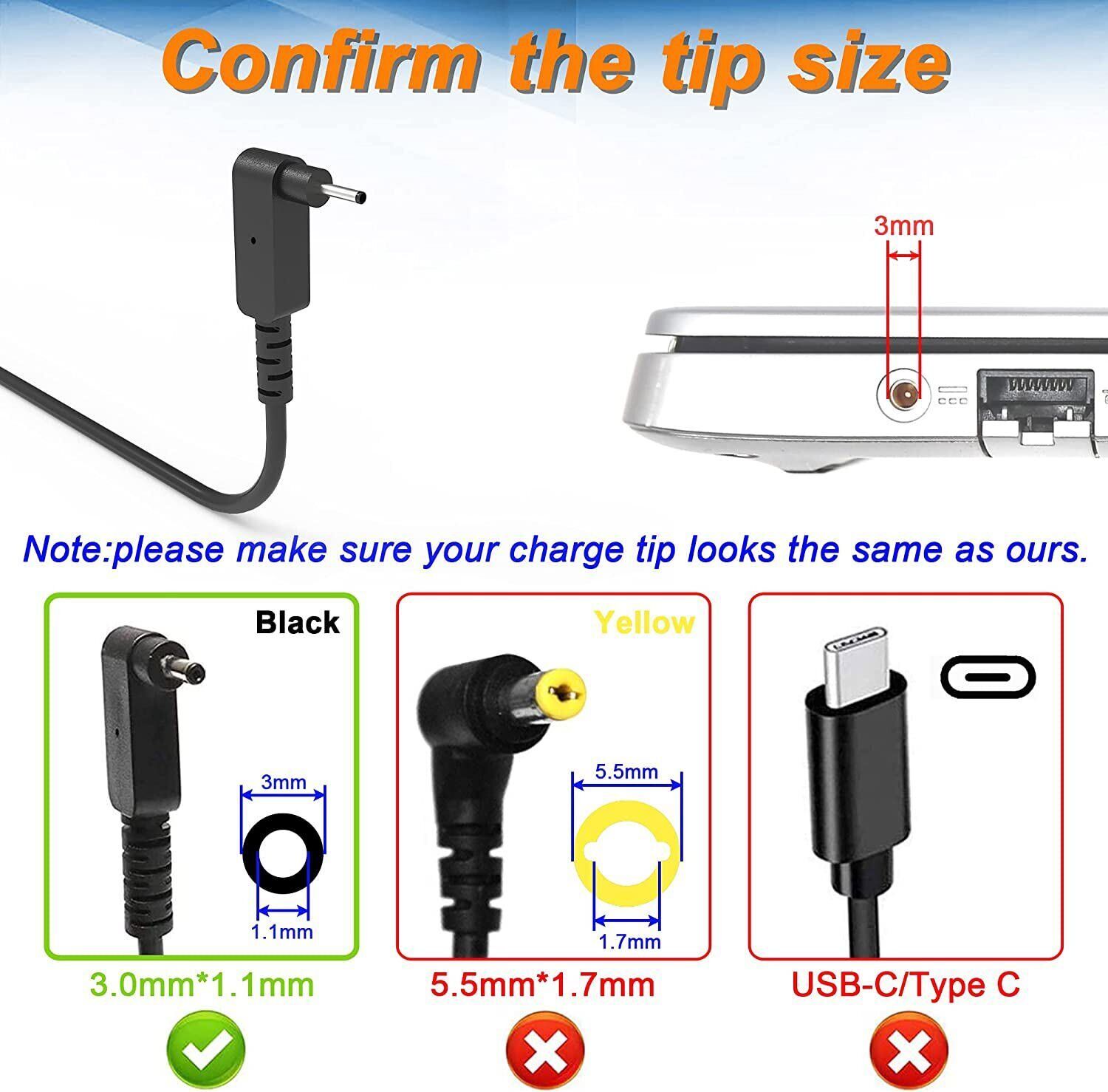 (Please check our description and the specification on the charger you’re using, to make sure you’re buying the correct charger)  NOT 5.0*1.7mm yellow tip