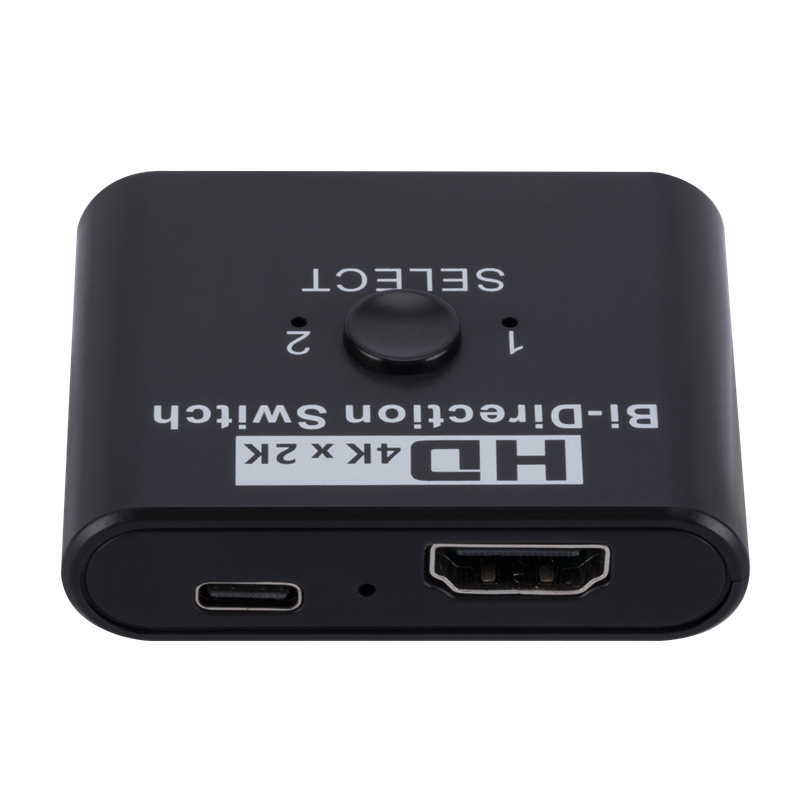 Two-way HDMI switcher with a switch button and two LED indicators on the top. This button actually allows you to select one of the two modes: whether to send signals from one device to the other two devices or in another way. This means that the switch is bidirectional-HDMI signals can go either way.