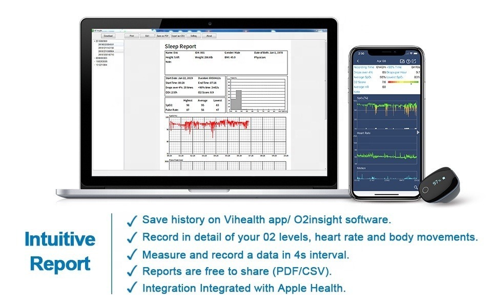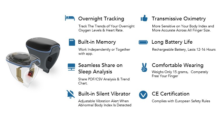 Recording parameters: blood oxygen level, pulse rate, body movement