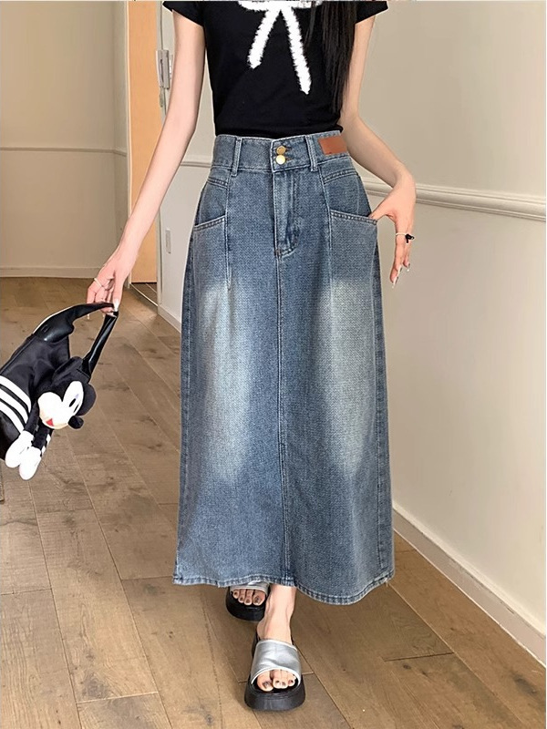 Retro denim skirt for women summer high waist back slit medium long slim a-line skirt
