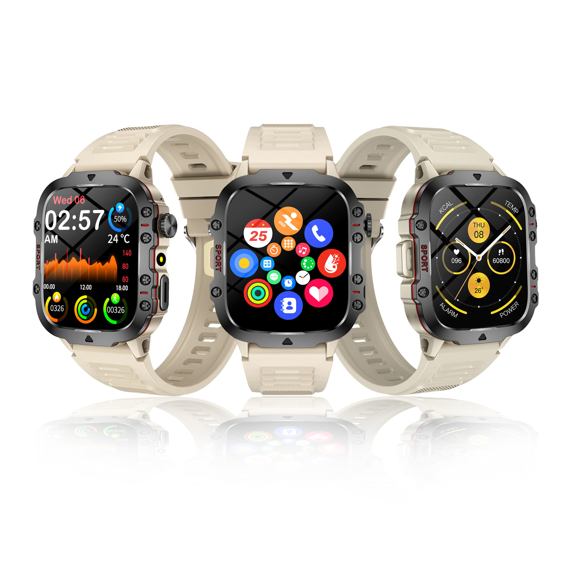 Functions: photo taking, step counting, heart rate monitoring, blood pressure measurement, social entertainment, Bluetooth calling, smart reminder, remote control selfie, sleep monitoring, blood oxygen detection