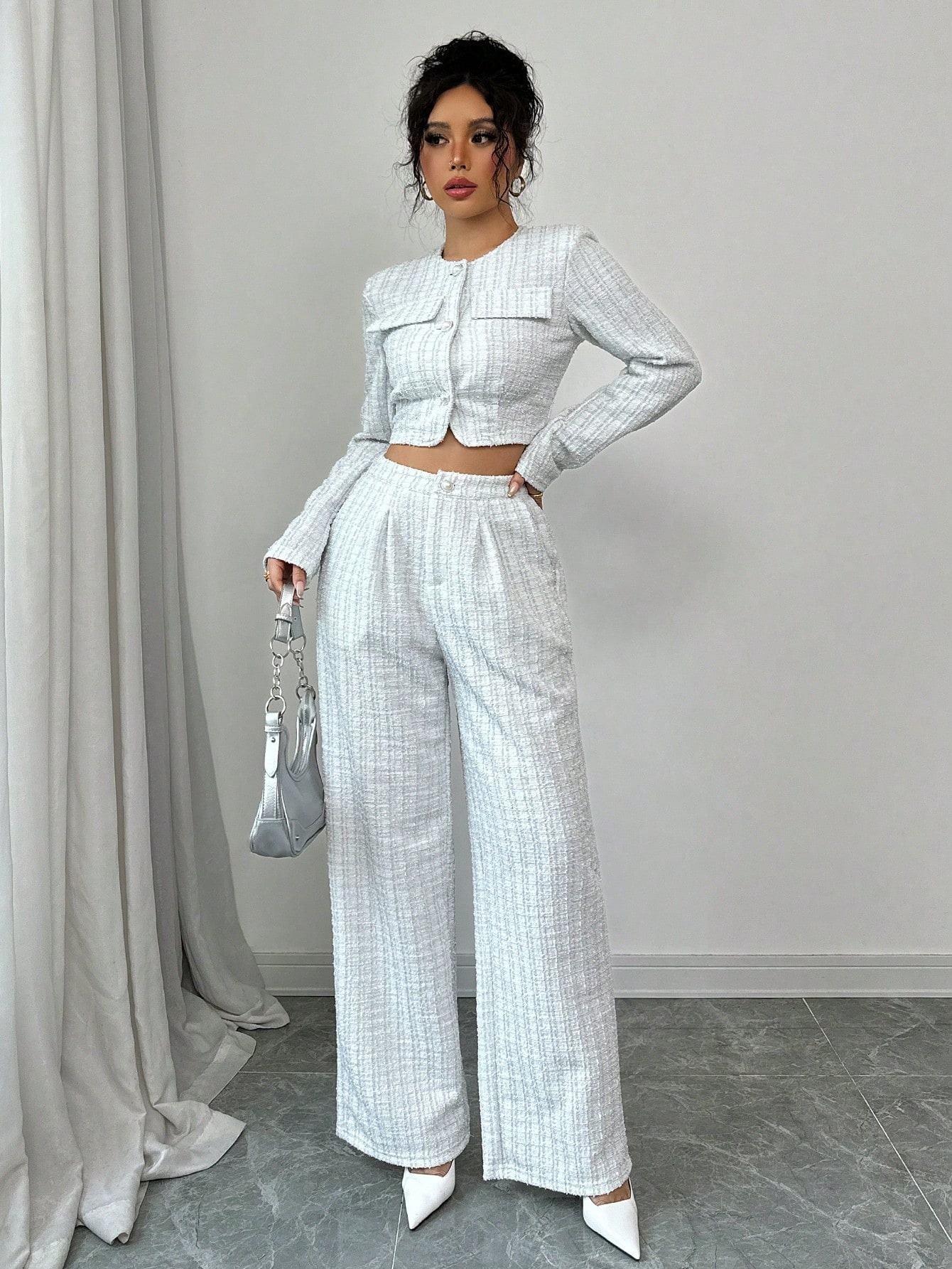 Spring And Autumn Long-sleeve Short-pants Suit, Tweed Short Jacket With Pearl Buttons, Elegant Round Neck Pearl Button Textured Jacket And Long Pants, Suitable For Commuting, Leisure, Dating, And Vaca