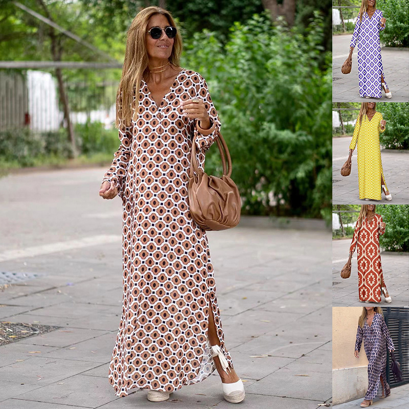09e6fb8f 6942 431c a78d dcfd4f85e719.jpgSummer Geometric Printed V-neck Long Dress Fashion Long Sleeve Slit Dresses For Women