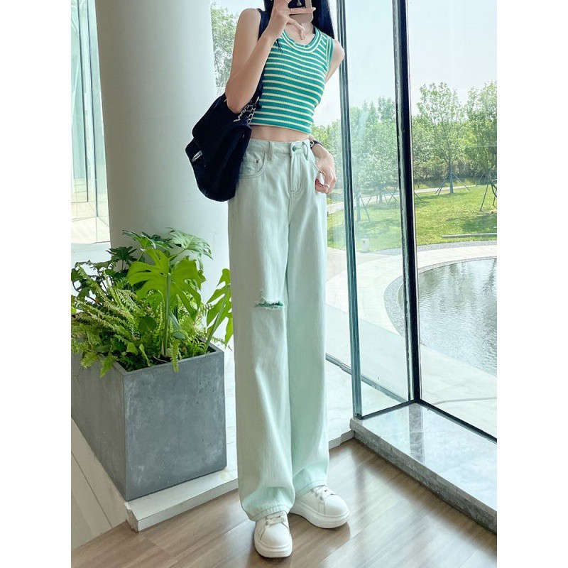 Summer thin mint green ripped wide-leg jeans for women high waist loose slim straight pants