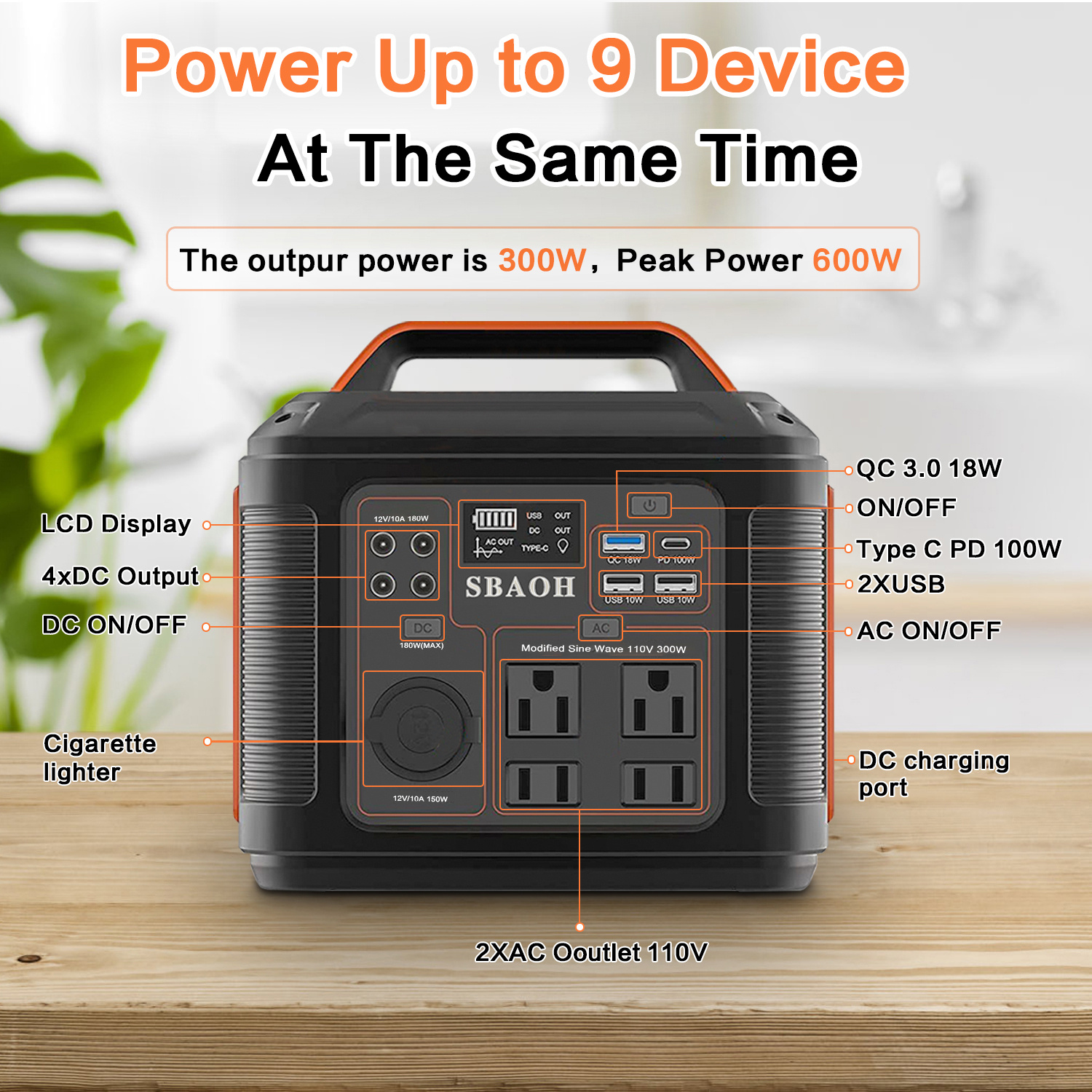 • ���80000mAh Back-up Power Supply���SBAOH P302 is equipped with a 296 watt-hour(14.8V 20Ah) lithium-ion battery pack, which features 4* AC outlets(110V Rated 300W – Peak 600W) , 1* PD 100W port, 1* QC 3.0 port, 2* USB-A Ports, 4* DC ports and 1* DC car socket. It provides 13 power output ports to charge multiple devices at the same time, such as laptop, phone, drone, car fridge and cameras, etc.
